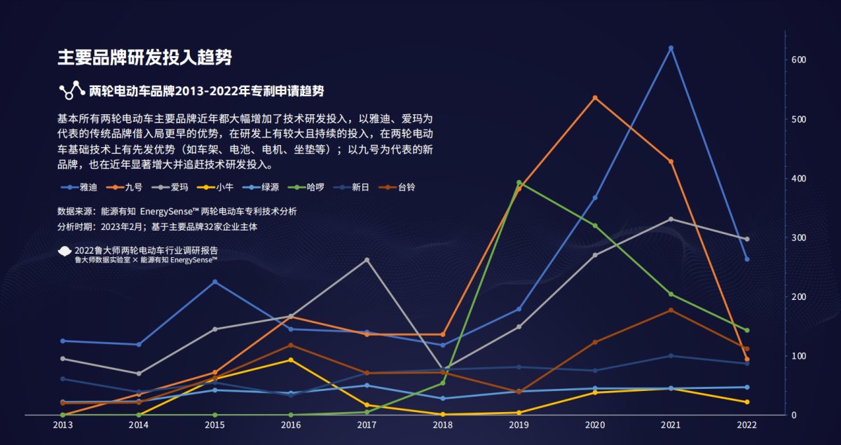 當前,兩輪電動車品牌在2013-2022年專利申請趨勢是基本所有兩輪電動車主要品牌近年都大幅增加了技術研發投入,以雅迪、愛瑪為代表的傳統品牌借入局更早的優勢,在研發上有較大的且持續的投入,在兩輪電動車基礎技術上有先發優勢(如車架、電池、電機、坐墊等);以九號為代表的新品牌,也在近年顯著增大并追趕技術研發投入。