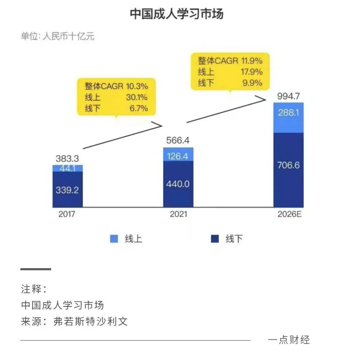 弗若斯特沙利文的報告顯示,中國成人學習市場規模預計將從2021年的5664億元,以11.9%的復合年增長率增至2026年的9947億元,是一個逼近萬億的寬闊賽道。