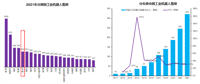 一個以工業為主的國家,其制造業機器人密度是衡量其工業化深度和廣度一個核心變量。根據IFR的數據,2021年全球平均水平是141臺/萬人,在2018年之前,市場邏輯是中國將追上世界平均水平,只不過這個追趕的速度太快,斜率過于陡峭,2017年還只有140臺/萬人,到2021年就提高到322臺/萬人,前面只剩下四個國家韓國、新加坡、日本和德國在風中瑟瑟發抖。