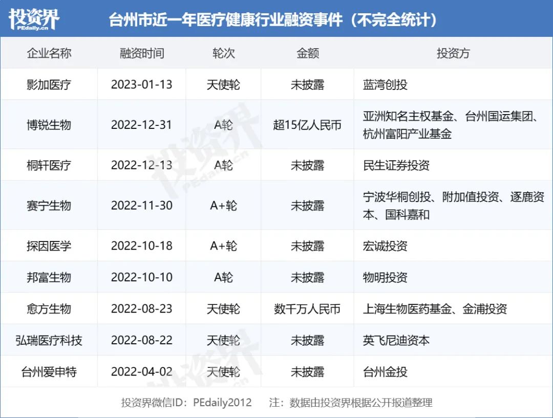 投資界-VC情報(bào)局根據(jù)公開(kāi)數(shù)據(jù)不完全統(tǒng)計(jì),截至目前,臺(tái)州市獲得融資的企業(yè)共183家,產(chǎn)生融資事件共212起。從細(xì)分領(lǐng)域來(lái)看,排名前五的行業(yè)分別是醫(yī)療器械、醫(yī)藥、汽車制造、新能源、機(jī)械設(shè)備。全市上市企業(yè)72家,市值超過(guò)300億元的公司有5家,分別是蘇泊爾、偉星新材、天山鋁業(yè)、九洲藥業(yè)和華海藥業(yè)。