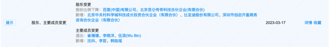 企查查顯示,近日,昆侖芯(北京)科技有限公司發生工商變更,新增投資方意外出現了比亞迪的身影。兜兜轉轉之間,王傳福和李彥宏又一次聯手。