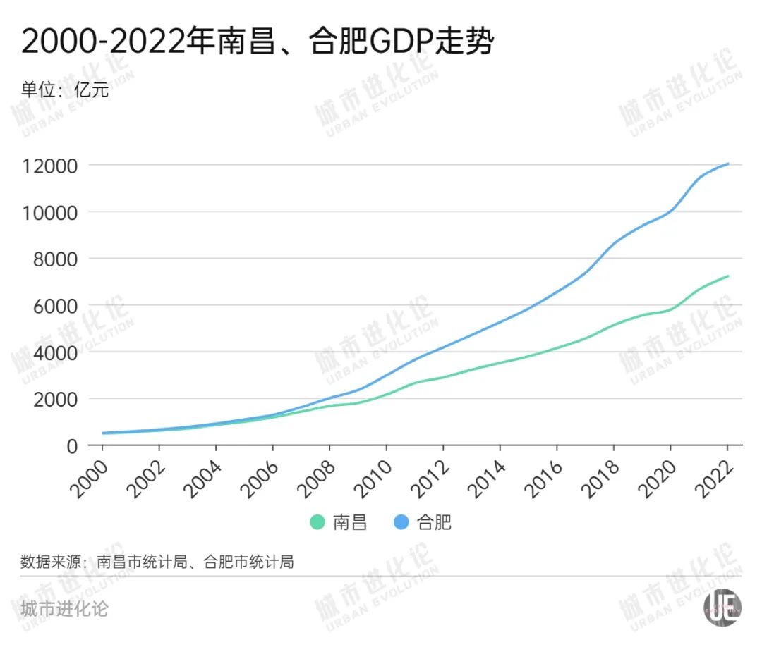中心城市是區域發展的縮影。2010年以前,南昌和合肥還處于同一起跑線,但此后差距不斷拉大,如今合肥GDP已經突破1.1萬億元,而南昌僅有前者的一半左右。