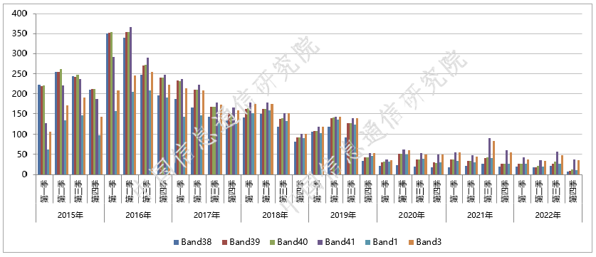 在4G手機頻段特性方面,根據(jù)中國信息通信研究院統(tǒng)計分析,2022年第四季度申請進網(wǎng)檢測的37款4G手機中,支持band41占比100%;支持band1的占比27.0%,支持band3的占比94.6%。