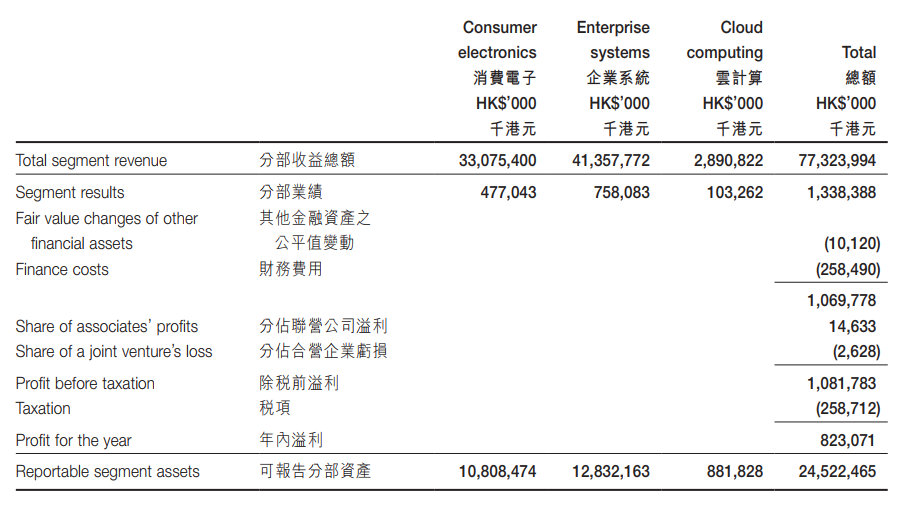 報告期內,實現收益773.24億港元,同比基本持平。消費電子分部的收益逆勢增加2.5%至330.75億港元,占集團總收益42.8%;云計算分部的收益同比大幅增加23.4%至28.91億港元,占集團總收益3.7%;企業系統收入達到413億港元。