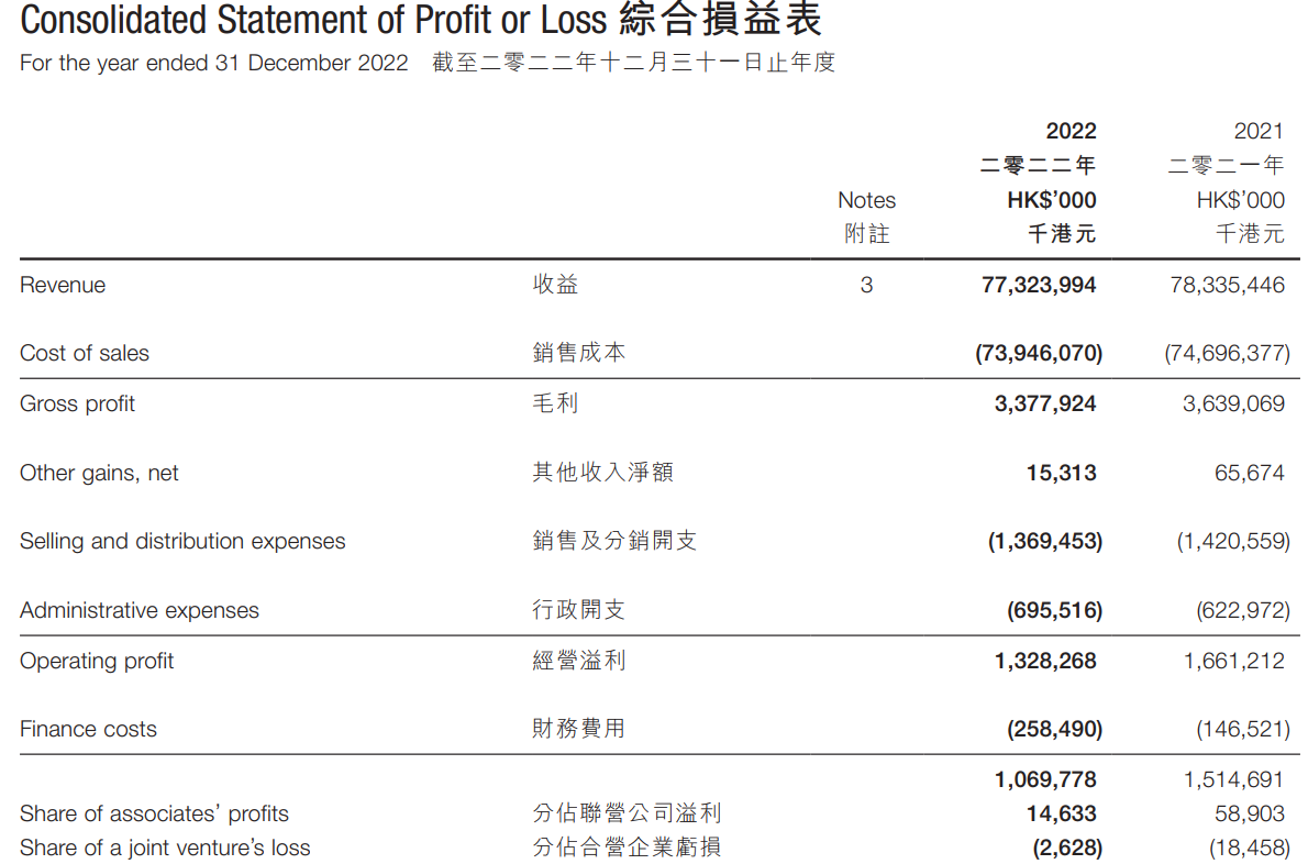從報告數據來看,公司營業收入抵御住了疫情、數碼電子消費需求低迷等不利因素,同比實現基本穩定。截至2022年12月31日實現營業收入773.24億港元,同比下降僅1.29%。