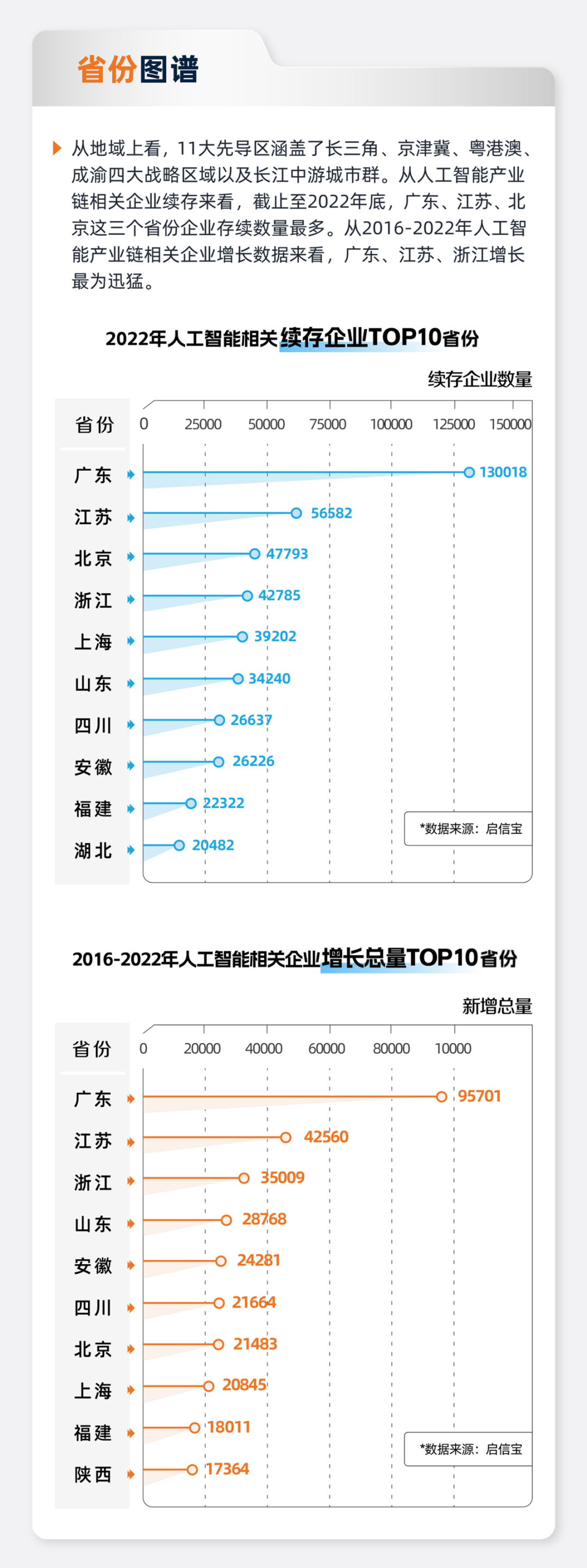 《中國人工智能產業圖鑒》顯示,2022年廣東人工智能相關企業數量達13萬家,領跑全國。江蘇、北京、浙江、上海、山東企業數量超過3萬家,與廣東一同構成“前五”陣營。這些省份均為國家人工智能創新應用先導區所在地,包括上海(浦東新區)、深圳、濟南-青島、北京等地,在人工智能技術突破、制度創新及產業發展上優勢明顯。