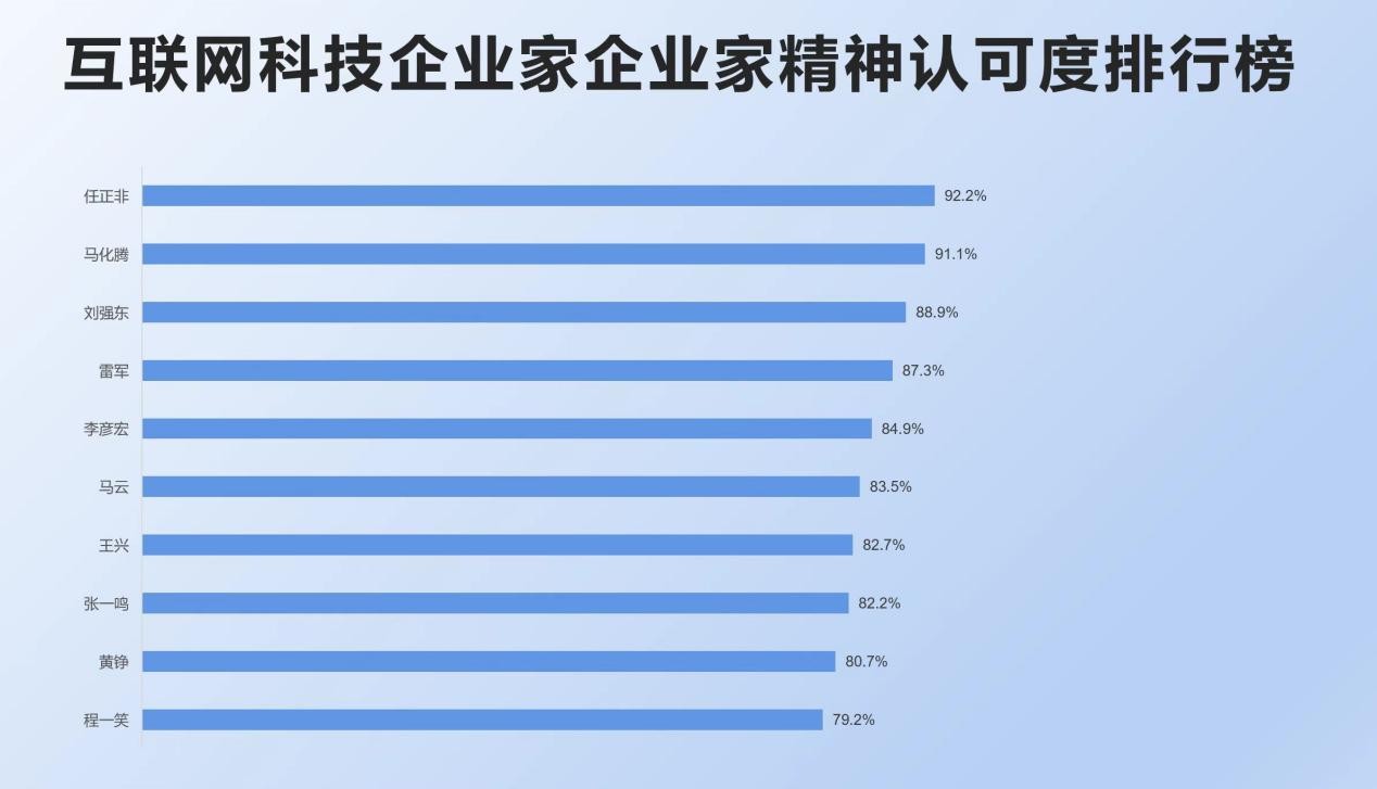 企業(yè)家精神榜單上,公眾對(duì)10家受調(diào)研互聯(lián)網(wǎng)科技企業(yè)家具備企業(yè)家精神認(rèn)可度基本都在80%以上,任正非、馬化騰排名前兩位,認(rèn)可度均超過90%。