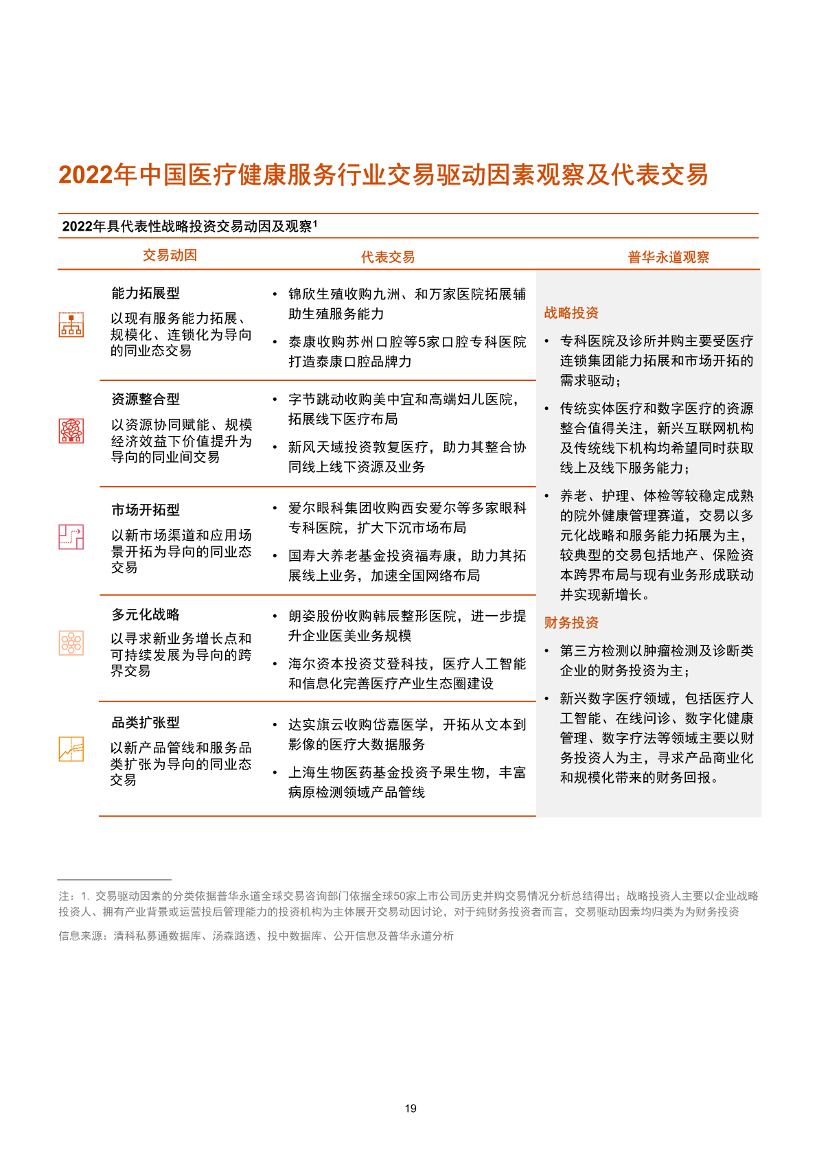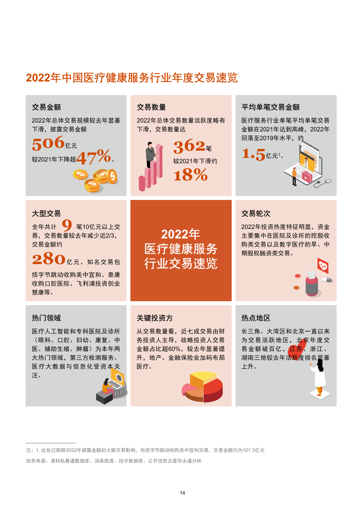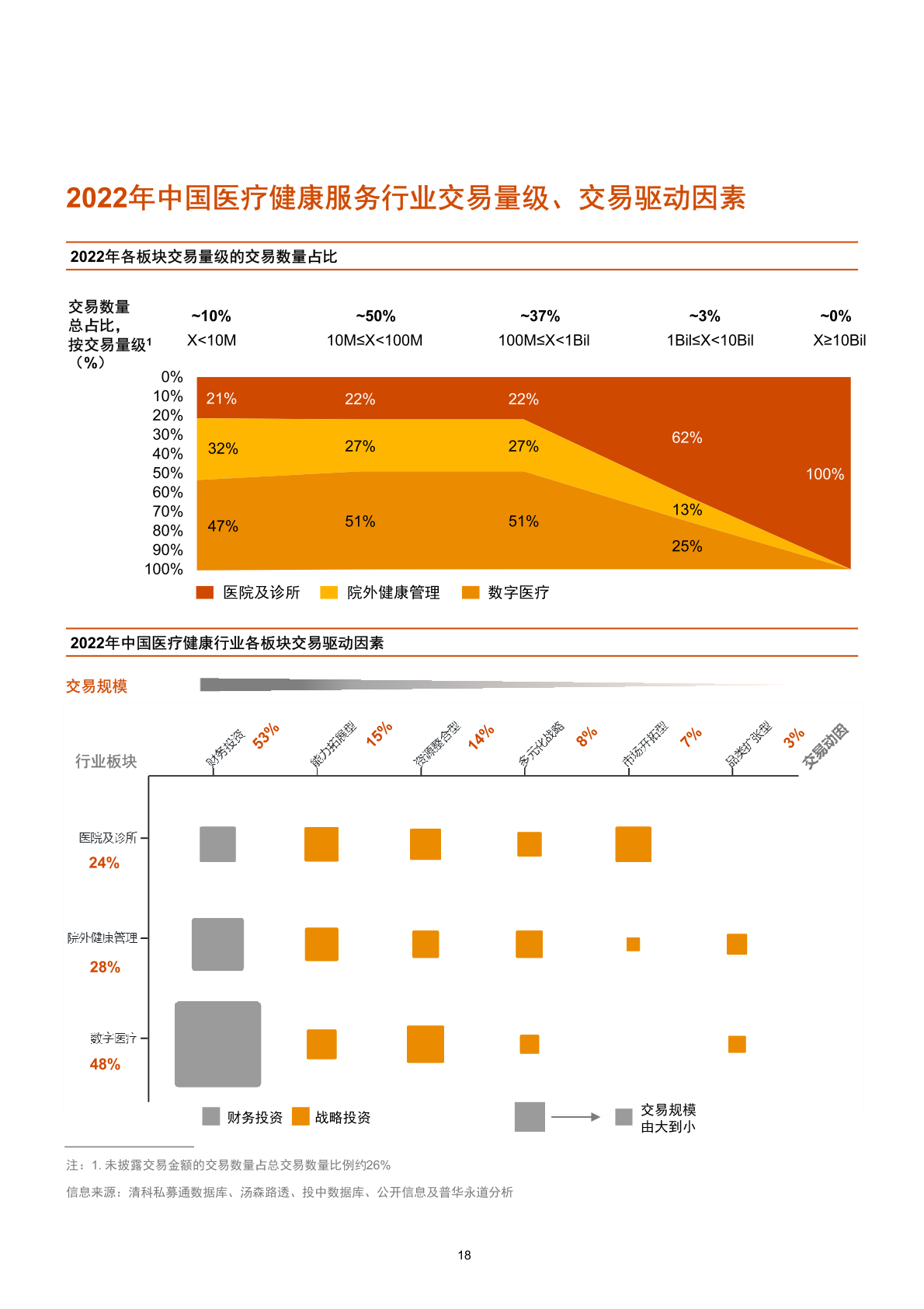 2022年數字醫療交易數量仍占主導,以投資數字技術在醫療領域的研發及應用為主,多樣化、細分化、早期化的投資領域和未來市場空間對投資人保持持續吸引力,投資呈現早期、分散的特點;醫院及診所披露交易金額保持歷史高位,醫院擴張與紓困兩級分化,戰略投資人具備充分的優勢和經驗主導交易,實現醫療服務投后賦能,投資速度雖然放緩,不乏一次收購多個醫療機構的大手筆。