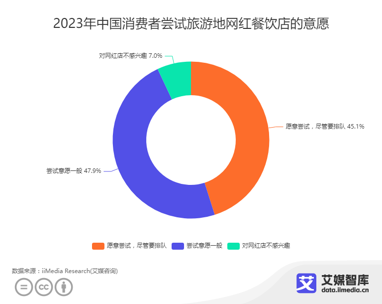 iiMedia Research(艾媒咨詢)數據顯示,在2023年中國消費者嘗試旅游地網紅餐飲店的意愿中,47.9%消費者表示嘗試意愿一般,45.1%消費者表示愿意嘗試,盡管要排隊,7%消費者會表示對網紅店不感興趣。