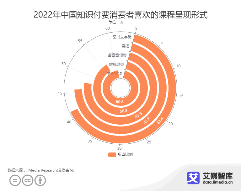 iiMedia Research(艾媒咨詢)數據顯示,在2022年中國知識付費消費者喜歡的課程呈現形式中,60.8%消費者表示偏好中長視頻,56.8%消費者表示偏好短視頻類,47.5%消費者表示偏好語音音頻類,45.7%消費者表示偏好直播,41.4%消費者表示偏好圖書文字類。