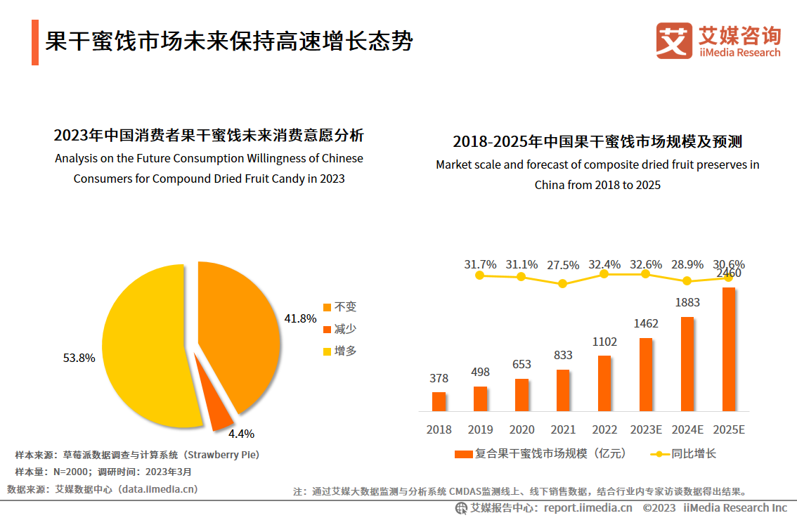 iiMedia Research(艾媒咨詢)新近發布的《2023年中國果干蜜餞市場研究報告》數據顯示,2022年中國果干蜜餞產品市場規模達1102億元,隨著果干蜜餞行業產品創新升級,消費者接受度和復購率高,尤其棗仁派類爆款產品銷量走俏,果干蜜餞產品創新成為市場新趨勢,2025年該市場規模有望達2460億元,果干行業將迎來市場增長新契機。