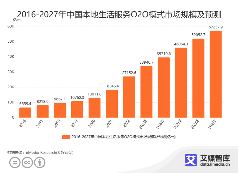 本地生活是一個(gè)龐大的市場,包括了餐飲、旅游、娛樂等多個(gè)領(lǐng)域。據(jù)艾媒咨詢數(shù)據(jù)顯示,2022年中國生活服務(wù)O2O模式市場規(guī)模達(dá)27152.6億元,預(yù)計(jì)2027年可達(dá)到57257.9億元。隨著移動(dòng)互聯(lián)網(wǎng)的普及和消費(fèi)升級(jí)的推動(dòng),本地生活市場的前景十分廣闊。