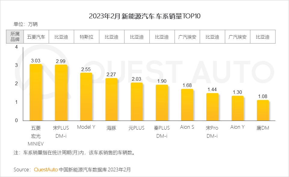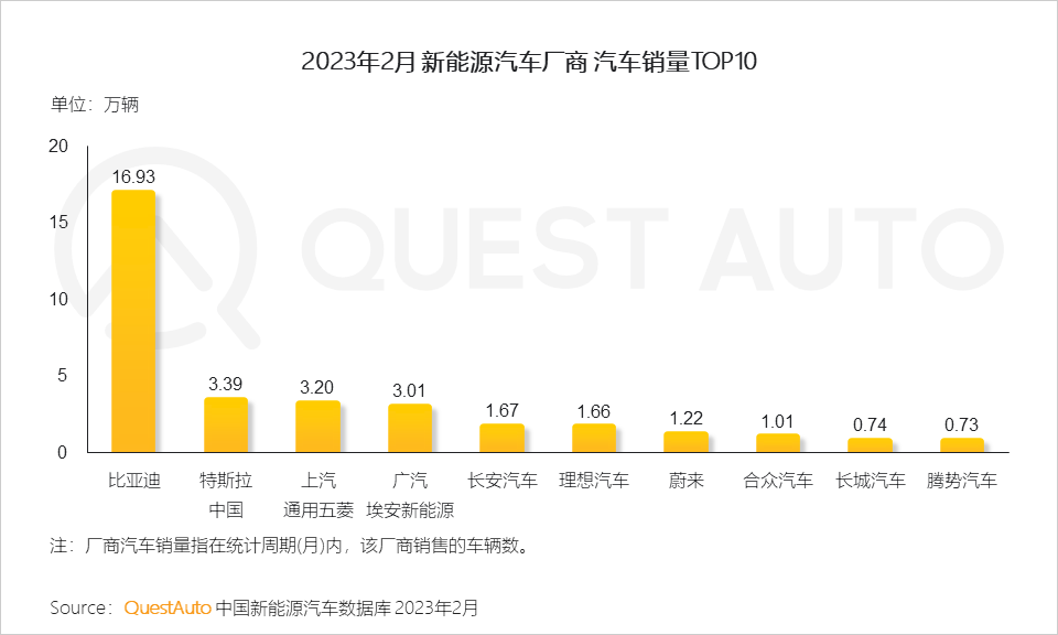 QuestAuto數據顯示,2023年2月,比亞迪以接近17萬輛的銷量處于行業領先,特斯拉中國、上汽通用五菱及廣汽埃安新能源三大廠商銷量均超3萬輛。