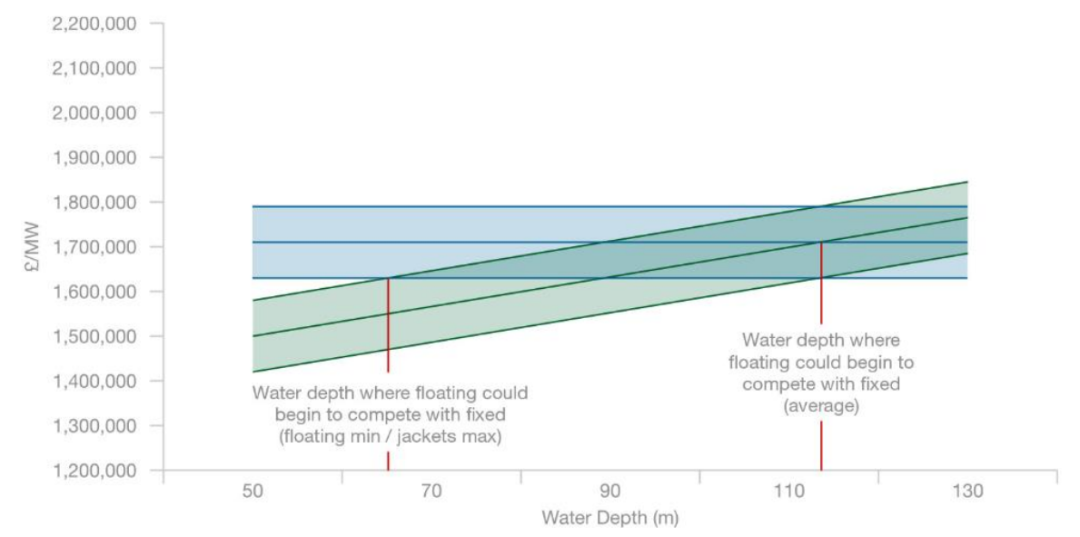 同時,伴隨著水深的增加,漂浮式風(fēng)電的經(jīng)濟(jì)性也逐漸凸顯出來。