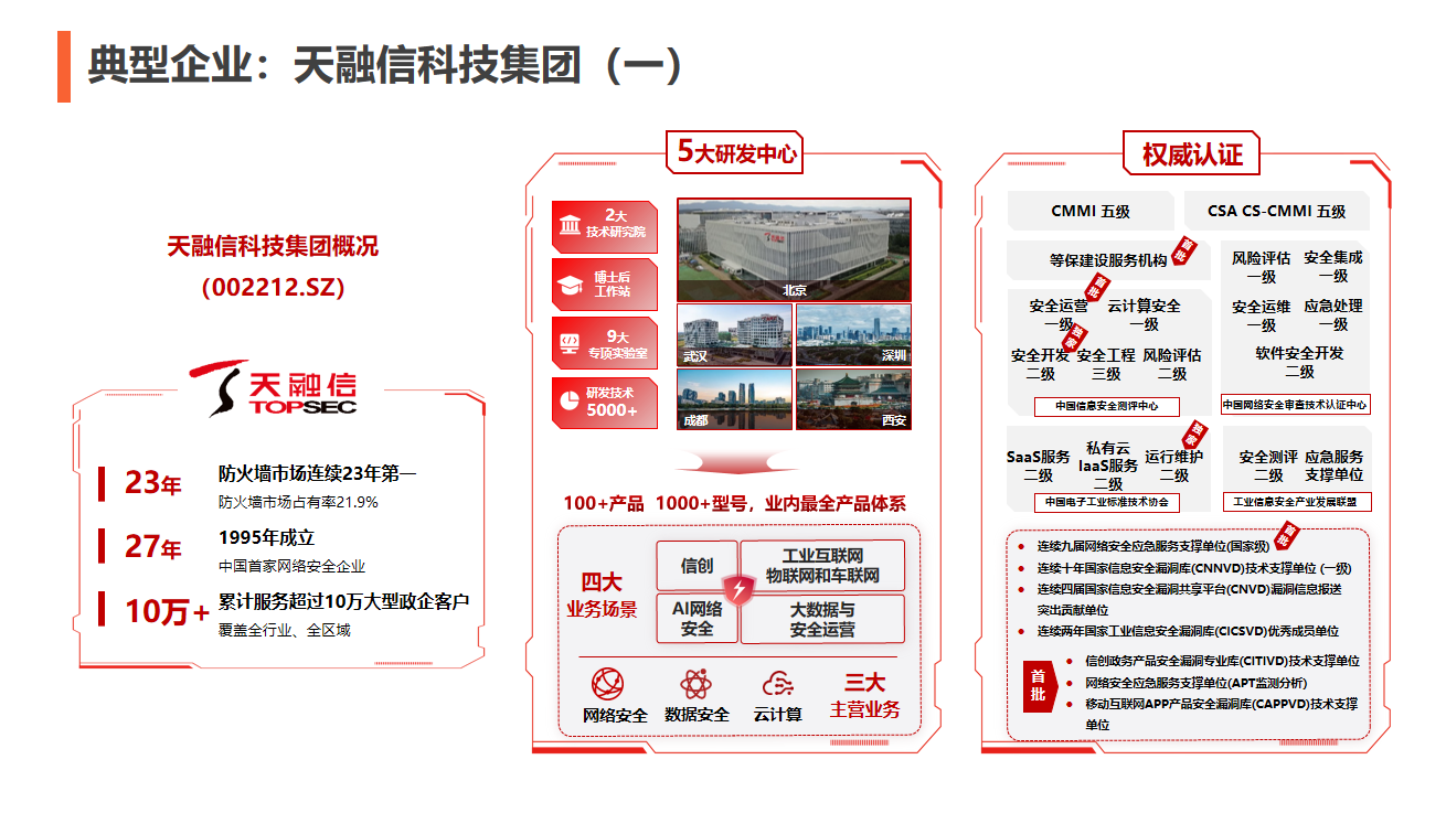 面對巨大的中國市場,天融信、深信服、奇安信、啟明信息、安恒信息、綠盟科技等各大頭部網(wǎng)絡(luò)安全上市公司爭相加碼布局。早在1995年,天融信就已經(jīng)窺到網(wǎng)絡(luò)安全產(chǎn)業(yè)市場前景。據(jù)了解,天融信是最早一家布局國家網(wǎng)絡(luò)安全的企業(yè),其締造了國內(nèi)首臺自主知識產(chǎn)權(quán)防火墻,如今成為了中國最大的網(wǎng)絡(luò)安全、大數(shù)據(jù)與云服務(wù)提供商之一。至今,天融信陸續(xù)推出了100余款產(chǎn)品,分別應(yīng)用于信創(chuàng)、工業(yè)互聯(lián)網(wǎng)、物聯(lián)網(wǎng)、車聯(lián)網(wǎng)、AI網(wǎng)絡(luò)、大數(shù)據(jù)與安全運(yùn)營等各大領(lǐng)域,實(shí)現(xiàn)了政府、金融、運(yùn)營商、能源、醫(yī)療、教育、交通、制造等行業(yè)的應(yīng)用覆蓋。