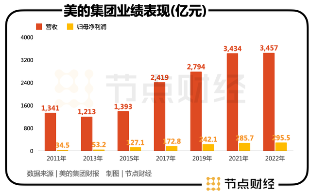 見微知著,正是公司持續押注,耐心打磨、沉淀出來的研發能力和技術進化能力厚澤潤本,并傳導至終端,最終落地到業績:在十年的長線維度里,美的營收和凈利潤皆畫出一條45°向上的曲線,也為日后更韌性、更游刃有余地生長打下基礎。