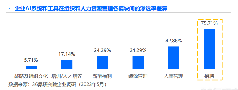 對于已實現AI布局的受訪企業而言,不同管理模塊間AI技術的滲透率也存在一定差異,多數企業已在招聘這一天然存在大量數據處理需求的場景更多的運用AI系統和工具(75.71%),遠高于人事(42.86%)、績效(24.29%)、薪酬福利(24.29%)、人才培養(17.14%)和戰略文化(5.71%)等其他模塊。