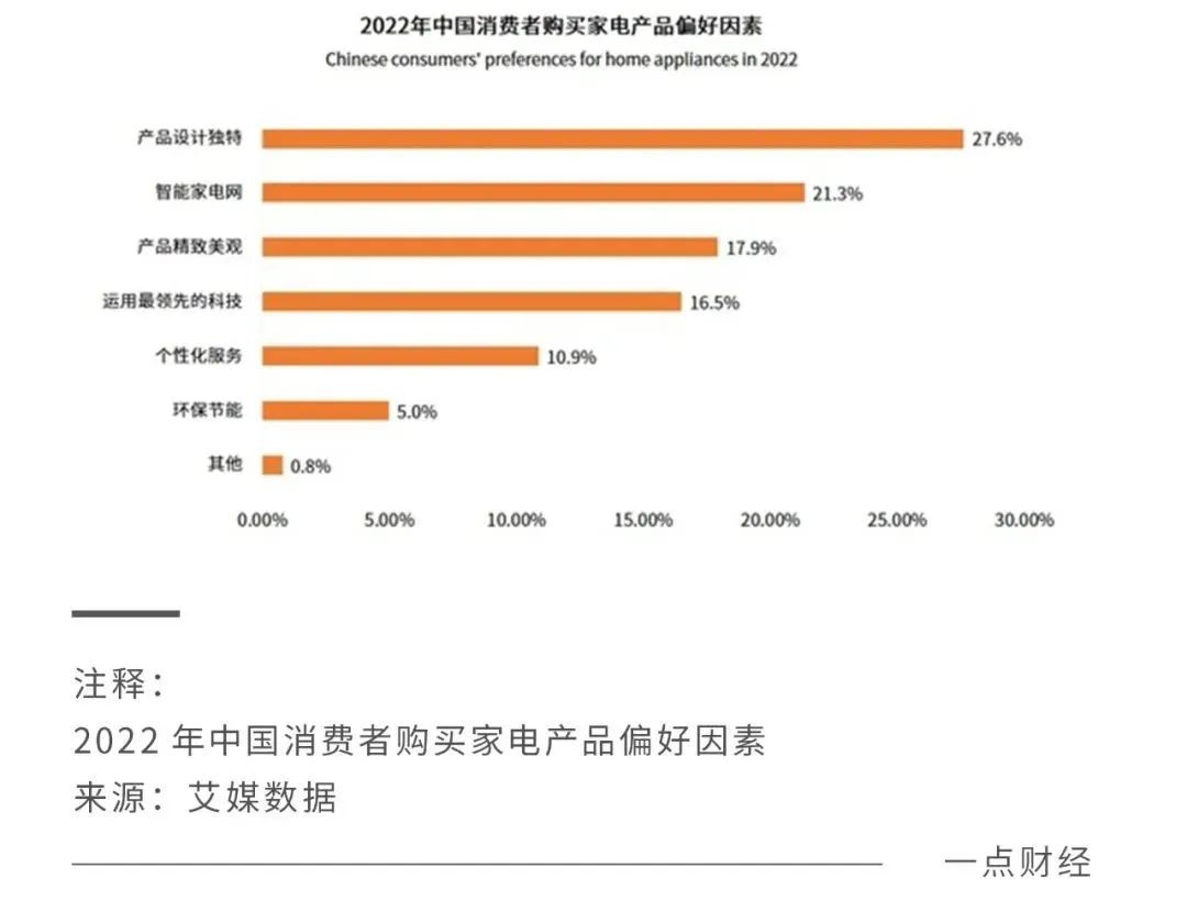 整體來看,消費市場對于家電的要求的確處于上升階段,艾媒咨詢報告顯示,產品設計獨特、智能家電網、產品精致美觀已經成為2022年中國消費者購買家電產品偏好因素中的前三甲。加上家電功能的迭代,都不斷在催化行業低端產品的淘汰。