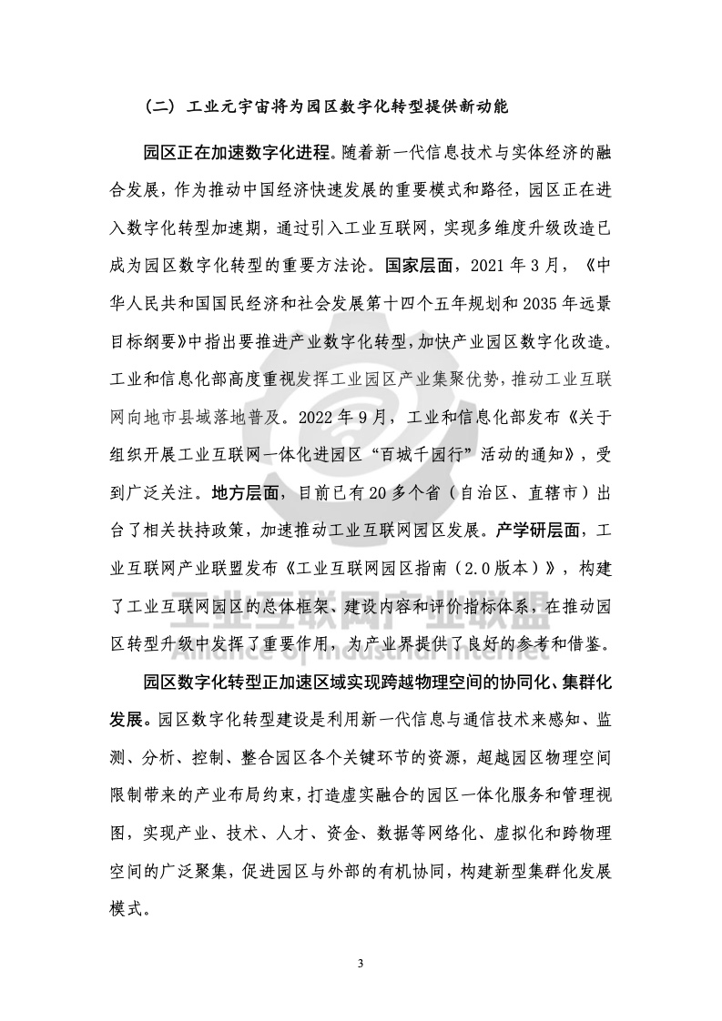 工業元宇宙是元宇宙重要的應用領域,通過擴展現實、數字孿生等技術促進工業經濟體系以及生產經營管理模式的變革。結合國家 “十四五” 數字經濟發展規劃提出的“探索發展跨越物理邊界的虛擬產業園和產業集群”、工業互聯網產業聯盟發布的《工業元宇宙白皮書》以及園區調研,為推動工業元宇宙賦能園區轉型升級,工業互聯網產業聯盟組織編寫了《工業元宇宙 園區應用白皮書》。