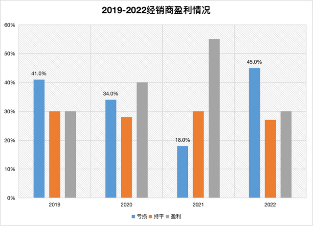 根據中國汽車流通協會發布的《2022年全國汽車經銷商生存狀況調查報告》(調查對象以乘用車授權經銷商為主),2022年僅有29.7%的經銷商實現盈利,較上年進一步縮窄。品牌經銷商的退網率同樣居高不下,2022年北京現代、別克、東風標致、斯柯達等合資品牌的合計退網率高達57%。