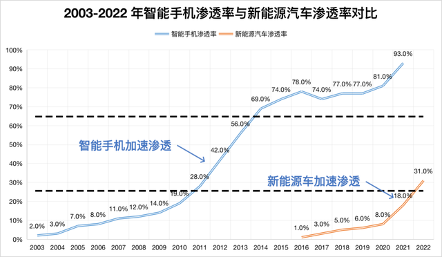 如果參考手機市場的替代路徑,就會發現新能源滲透趨勢與智能手機的滲透路徑十分相似。