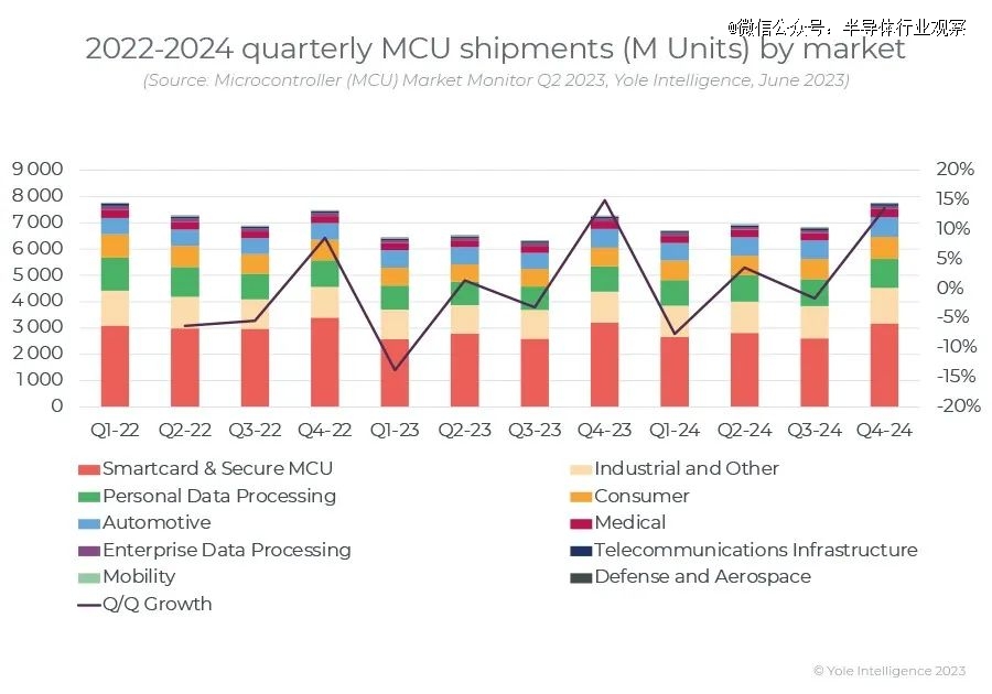 工業領域是一個相對較穩定的市場,出貨量也相對變化不大,是MCU出貨量第二大的市場。再就是個人數據處理的應用,在這個市場,MCU主要是用來幫助設備收集、處理和保護個人數據。然后是消費類、汽車,消費電子不必多說,汽車MCU是近年來關注度較高的市場,汽車“三化”進程正在加速帶動車規級MCU單車用量增長。再就是醫療等領域,MCU在醫療設備中扮演著關鍵角色,從便攜式醫療設備到健康監測器材,都需要高度集成的處理器來實現功能。