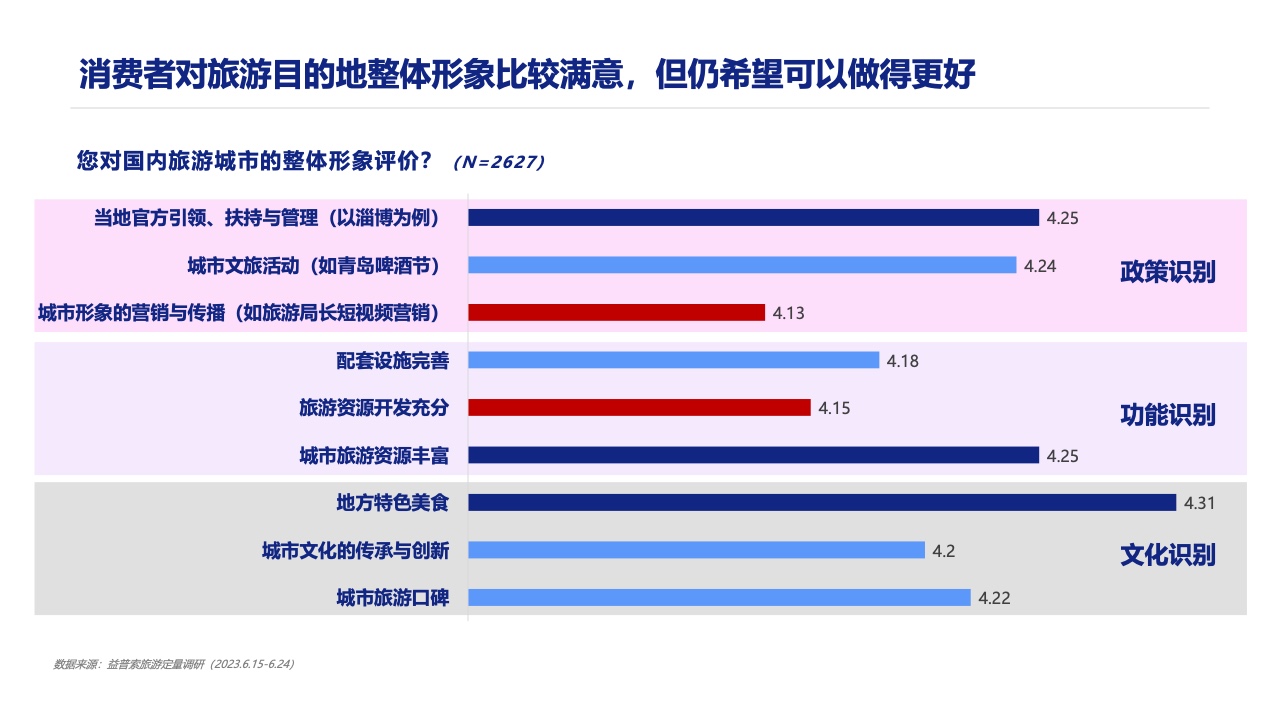 整體上,消費(fèi)者對(duì)旅游目的地整體形象比較滿意,但希望可以做得更好。具體可以從政策、功能、文化三個(gè)方面理解消費(fèi)者對(duì)國(guó)內(nèi)旅游城市的形象評(píng)價(jià):