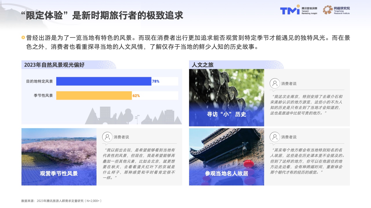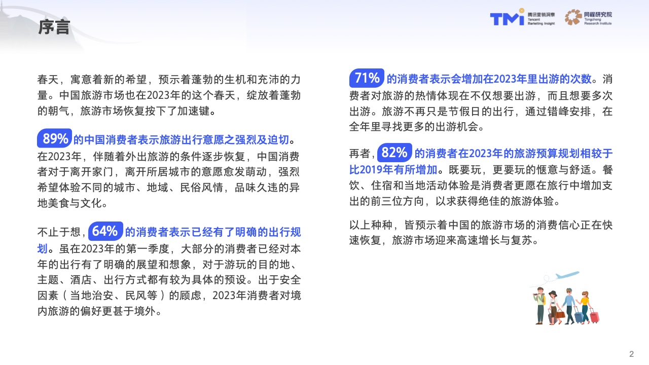 89%,的中國消費者表示旅游出行意愿之強烈及迫切。在2023年,伴隨著外出旅游的條件逐步恢復,中國消費者對于離開家門,離開所居城市的意愿愈發萌動,強烈希望體驗不同的城市、地域、民俗風情,品味久違的異地美食與文化。