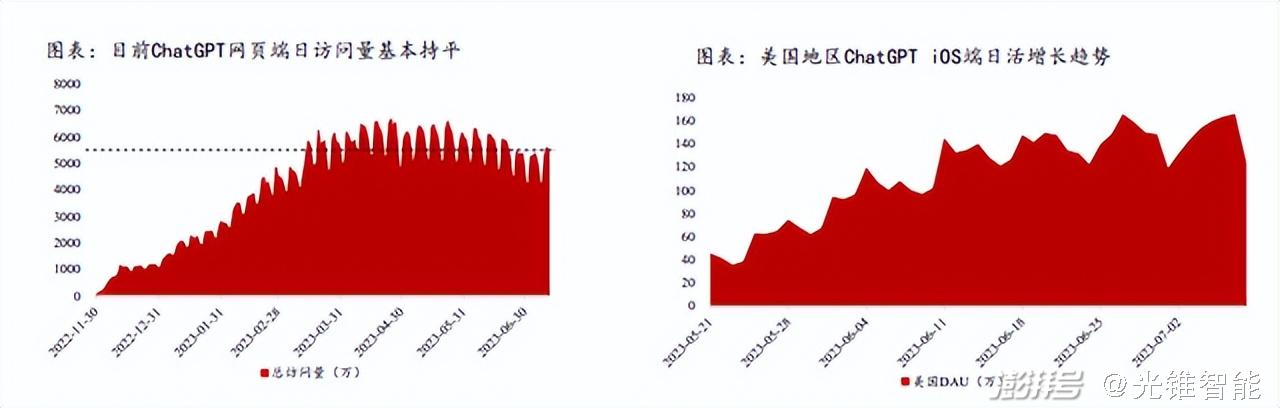 截至2023年7月12日,ChatGPT網頁日訪問量已基本持平,維持在五千多萬。截至2023年6月19日,OpenAIChatGPTiOS端美國地區前30日平均日活躍用戶94.6萬人。