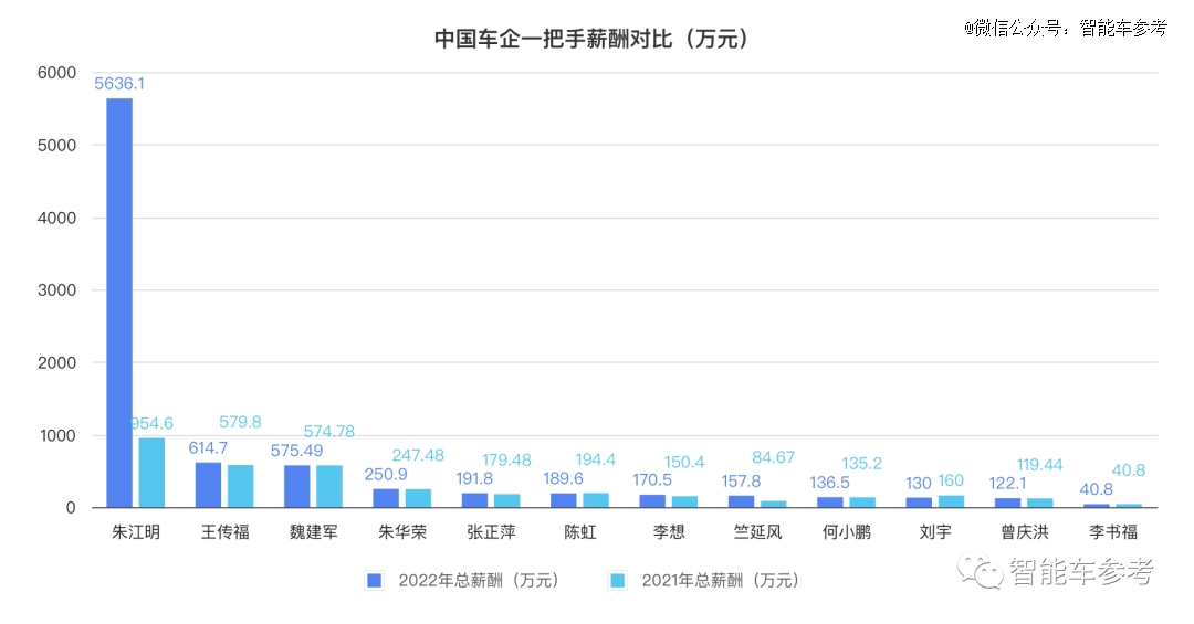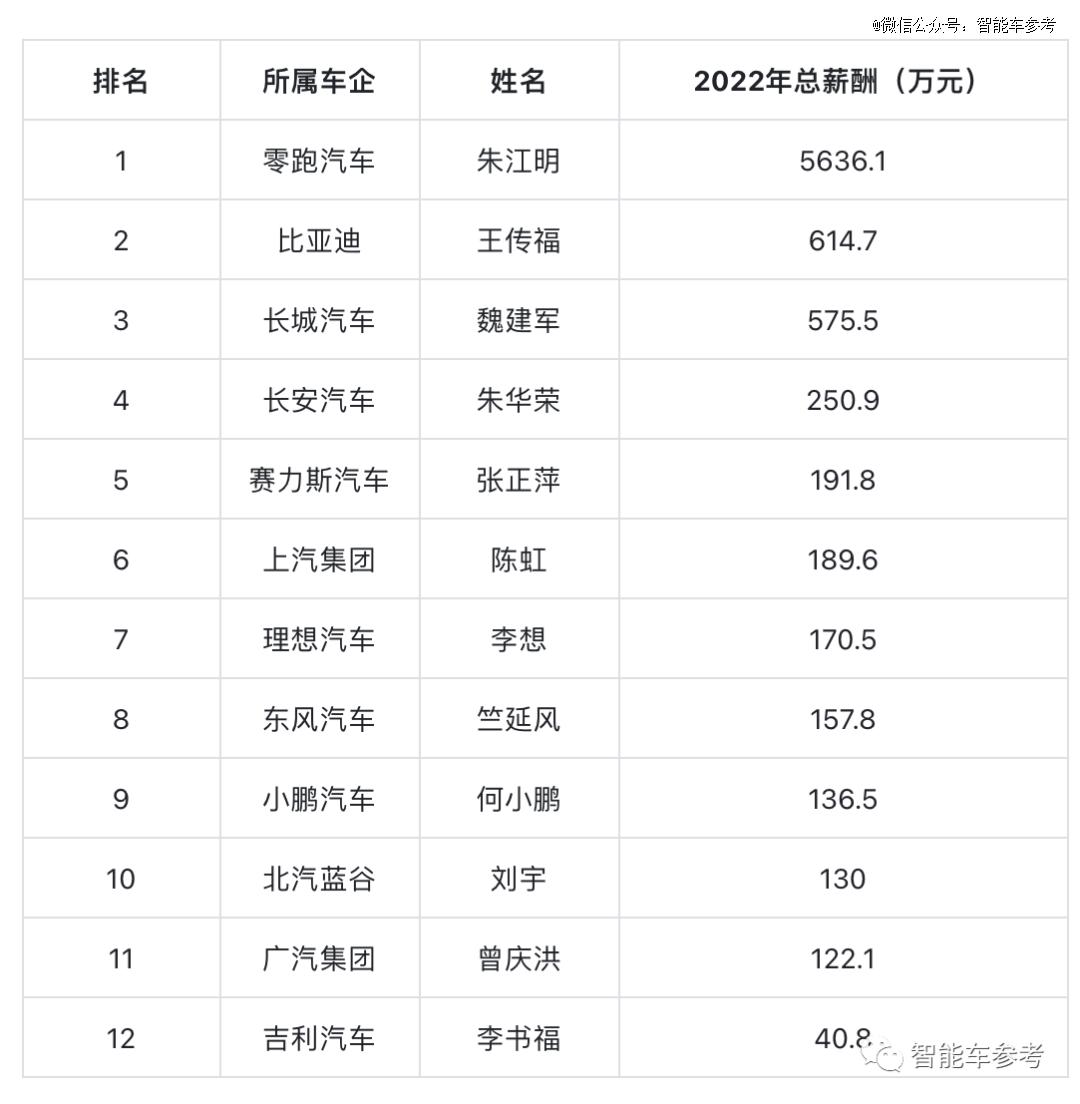 除了蔚來李斌的薪資沒有詳細披露,2022年總薪酬最高的是零跑汽車的朱江明,薪酬總額為5636.1萬。