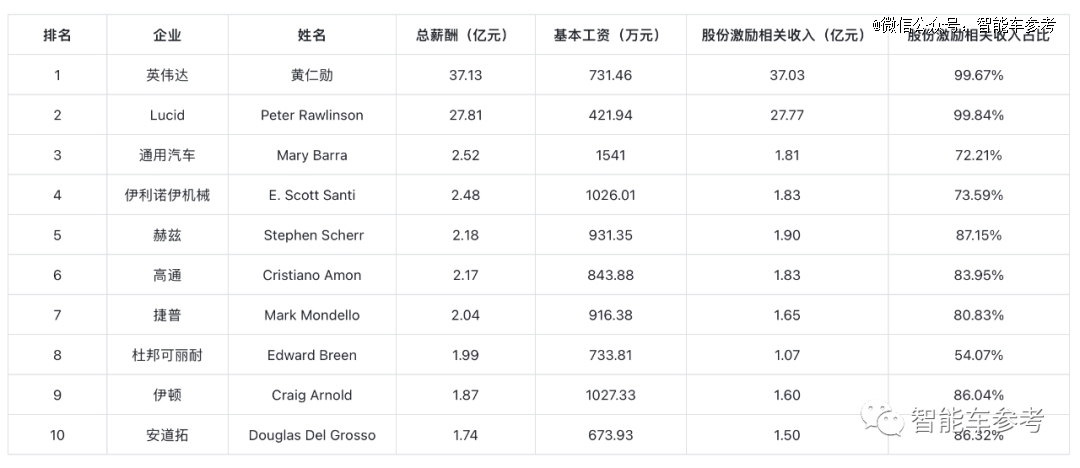 所以排在前兩位的英偉達黃仁勛和Lucid CEOPeter Rawlinson。雖然基本工資和其他人比不高,但因為激勵計劃獲得的對應(yīng)股份,總薪資還是超過上億美元,股權(quán)激勵相關(guān)收入占比超過99%。