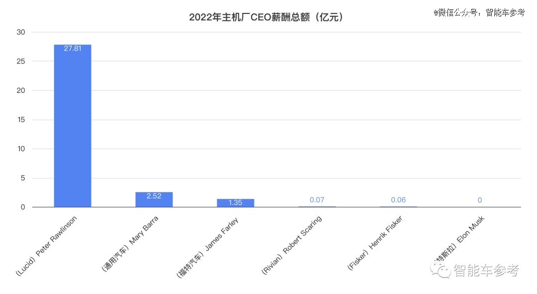 就算排除主機廠CEO收入*,Lucid的Peter Rawlinson,排在第二的通用汽車CEO的薪酬是倒數(shù)第二Fisker CEO的42倍。