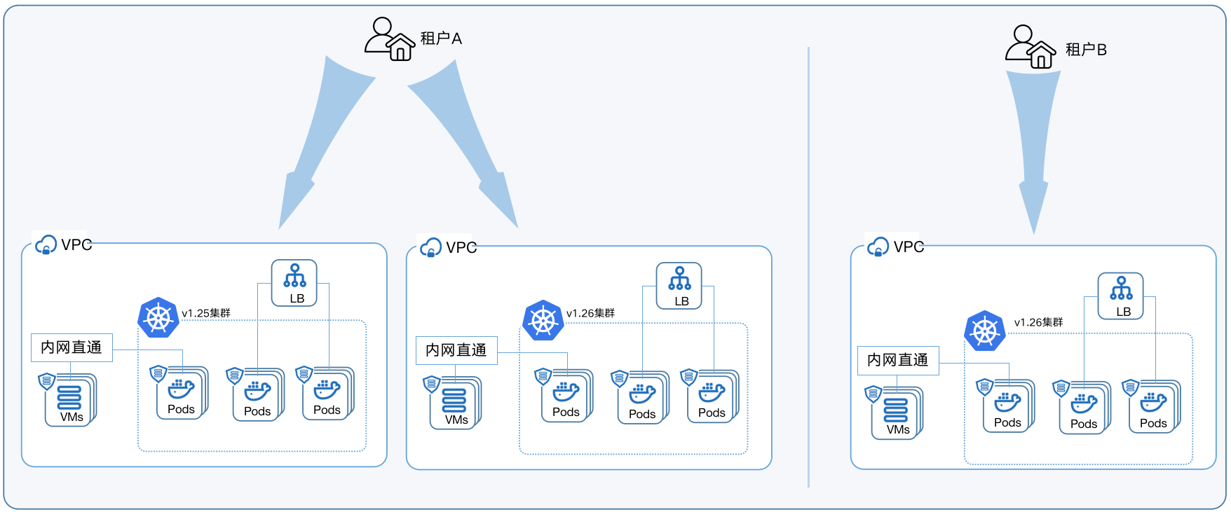 得益于UCloudStack私有云平臺成熟完善的多租戶架構,容器服務原生支持多租戶、多集群。平臺租戶可在配額允許的情況下創建多個不同版本的容器集群,租戶間的容器集群資源完全隔離,同一租戶下的多個容器集群亦可通過VPC實現集群網絡的隔離,方便租戶根據業務隔離需求進行多集群規劃。
