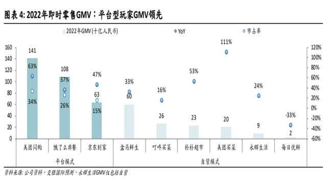交銀國際統計顯示,2022年團閃購與美團買菜的合計GMV合計超過1600億元,其次為餓了么非餐為1080億元,第三是京東到家的630億元,三者占當年我國即時零售總GMV(不包含餐飲外賣)的比例超過75%。