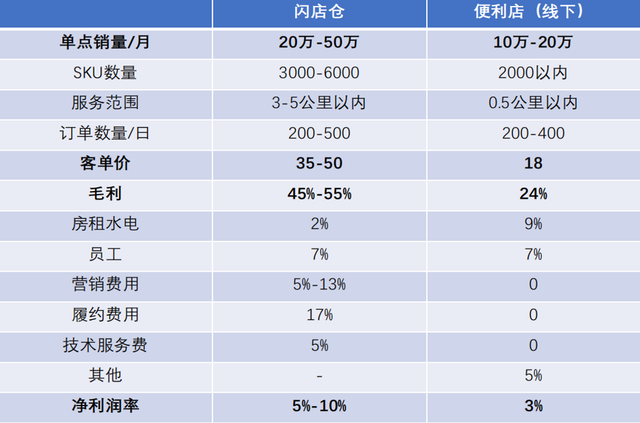 今年4月份,其在《第八屆中國快消品創新大會》現場分享的一組數據顯示,閃電倉由于SKU多、服務半徑大、客單價高等優勢,其整體毛利率分布在45%-55%之間,是傳統便利店24%的近兩倍,同時前者凈利率達到5%-10%,同樣是便利店3%的兩倍多。