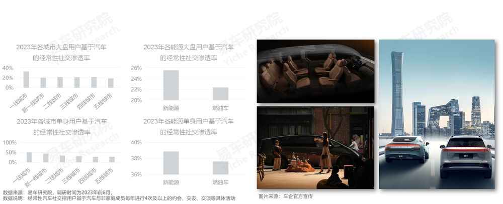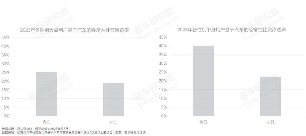 如果純粹從“暴力美學”的視角優化運動類產品,車企可能把單身或屌絲用戶想簡單了。易車研究院調研顯示,2023年男性用戶基于汽車的約會、交友等社交滲透率明顯高于女性,單身男性尤其顯著,汽車社交滲透率超過40%;