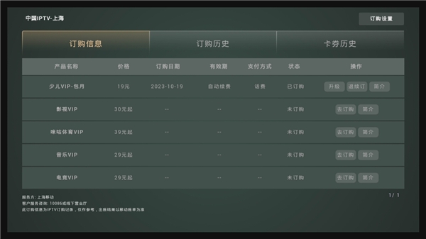 與免費內容“顯而易見”相比,付費則需要多次操作才能完成。在支付頁,用戶可清晰地查看增值產品收費價格、詳細的訂購說明和服務協議,用戶可點擊“確認”鍵進行賬單支付,也可以掃描右側二維碼進行手機掃碼支付。用戶若選擇賬單支付方式訂購連續包月產品時需要進行二次確認。頂部菜單中提供“應用中心”和“我的”快捷入口,規范各類電視應用安裝和用戶訂購信息管理,防止“吃悶虧”和“誤操作”。