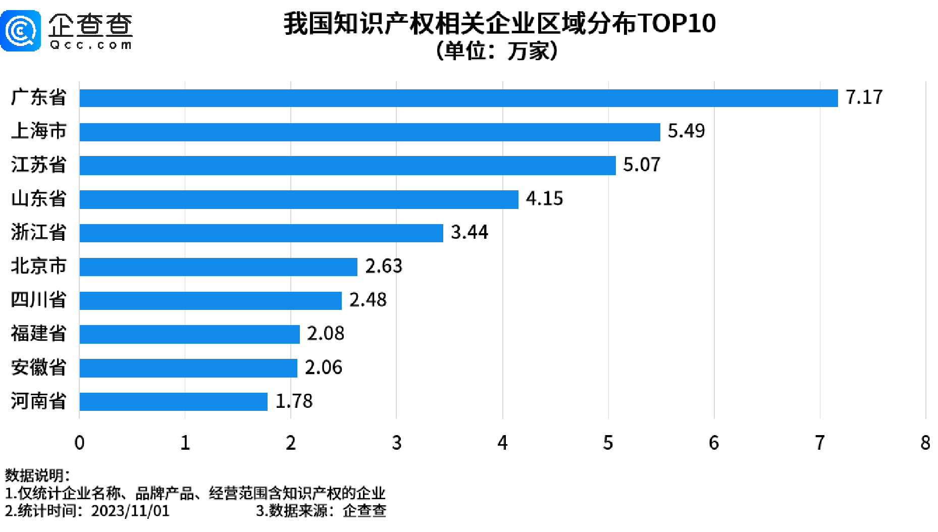 廣東省發布《廣東省市場監管現代化“十四五”規劃》,政策指出要加強重點安全領域監管、強化知識產權保護運用,推進知識產權強省建設,強化關鍵領域自主知識產權創造和儲備,深化知識產權與產業發展融合,構建“嚴保護、大保護、快保護、同保護”格局。在政策利好的大環境下,據企查查顯示,廣東現存知識產權相關企業7.17萬家,位居第一。