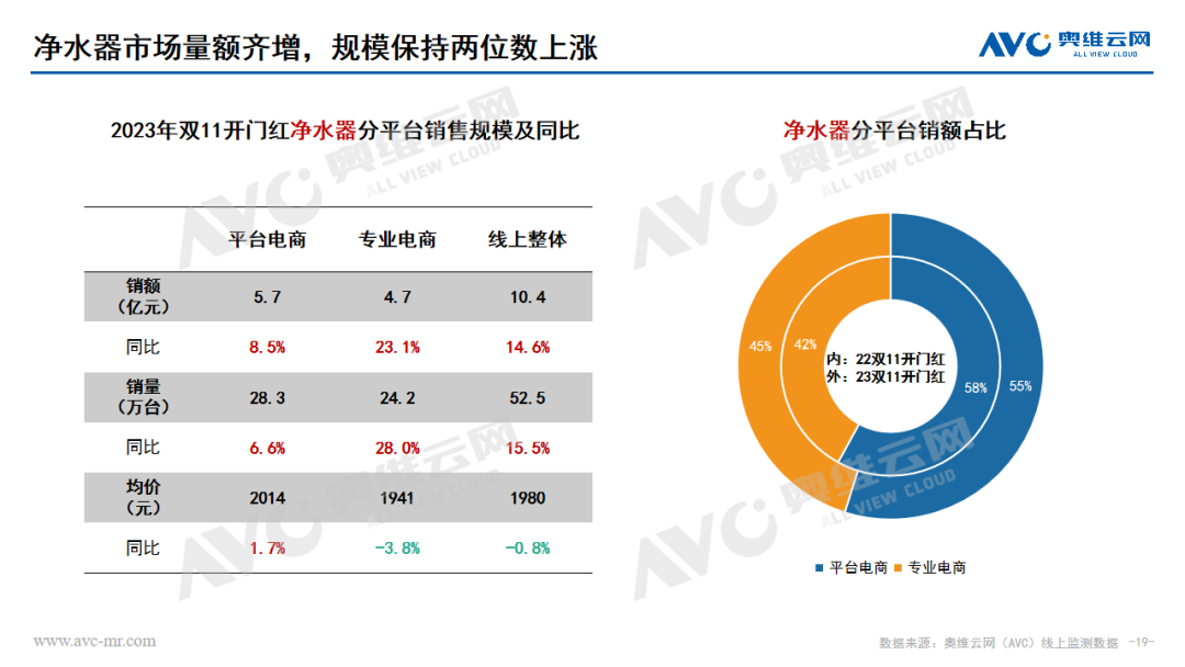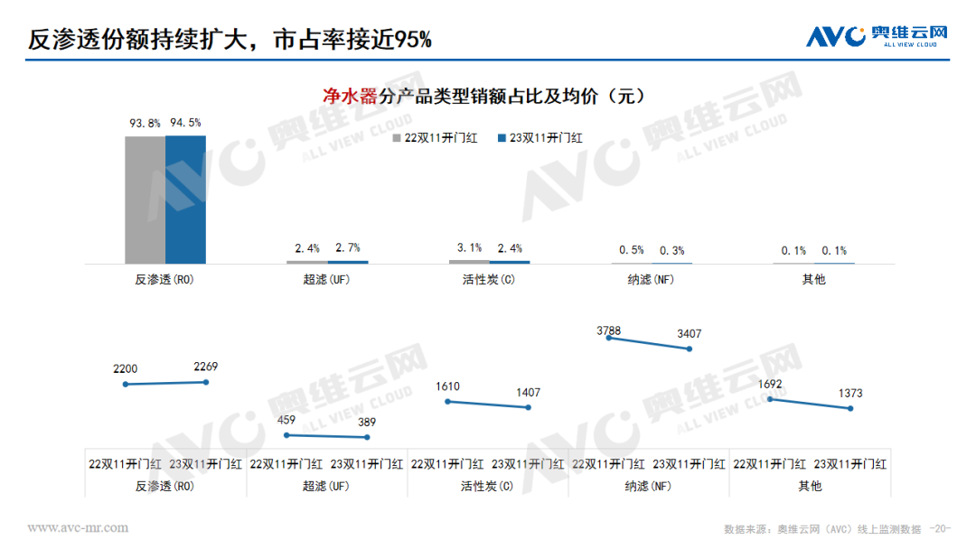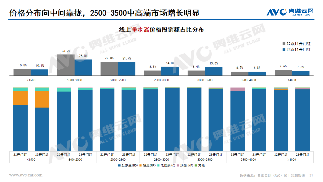 水家電:凈水器市場在雙十一開門紅期間量額齊增,均保持兩位數(shù)的上漲幅度。價格分布呈現(xiàn)向中間靠攏的趨勢,2500-3500份額大幅上漲,產(chǎn)品升級迭代、推新趨勢明顯。凈飲機市場在雙十一開門紅期間銷額同比增長33.6%,銷量同比增長12.6%,高端化趨勢明顯,產(chǎn)品功能集成升級和嵌入式產(chǎn)品發(fā)展帶動整體市場格外紅火。飲水機市場也是保持了量額齊增的狀態(tài),價格分布受到產(chǎn)品結(jié)構(gòu)影響不斷分化,低、高兩端份額同步上漲,茶吧機占比份額持續(xù)提升,套餐熱銷帶動管線機市場持續(xù)增長,桌面式產(chǎn)品均價下探。