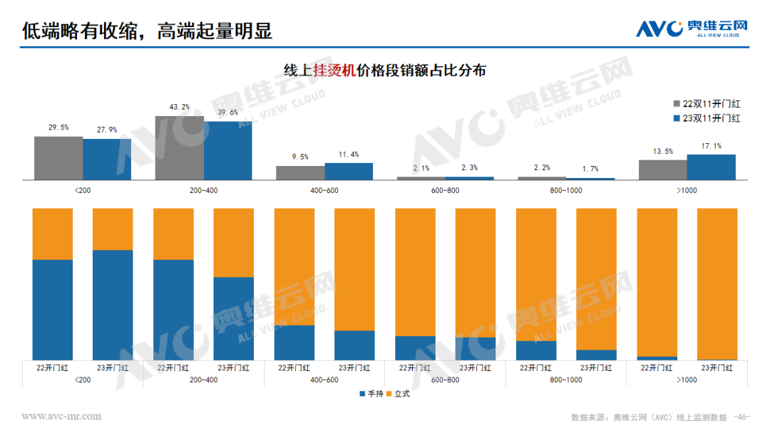 掛燙機:從市場表現(xiàn)來看,掛燙機整體市場沒有明顯修復(fù)。零售額、零售量的同比分別為-4.3%、-10.5%。從產(chǎn)品類型來看,立式掛燙機占比提升,同時也帶動了整體均價的上揚。從價格分布來看,中低端產(chǎn)品仍是主流,但高端1000+有明顯增長。