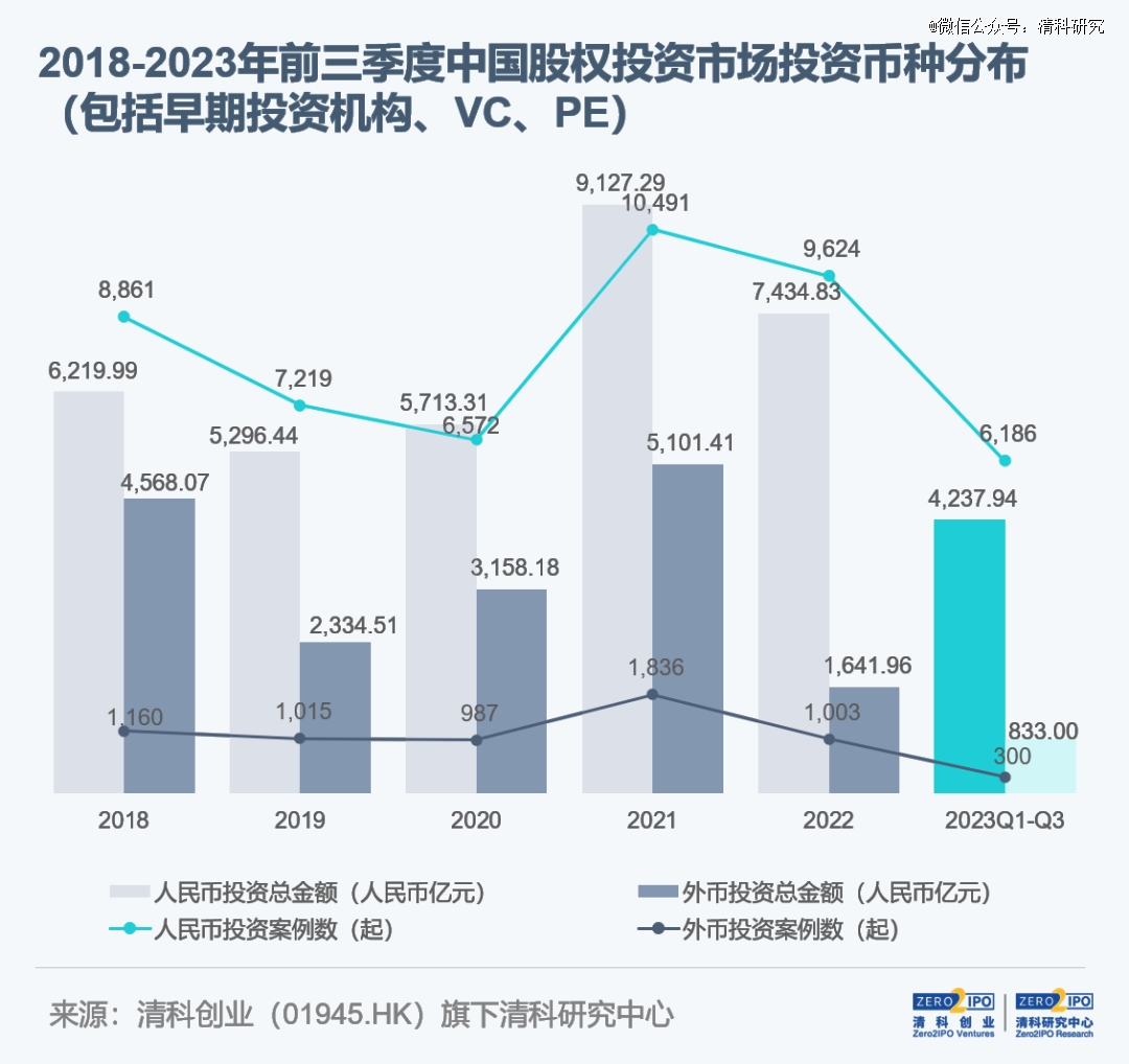 分行業來看,兩者重點布局領域有所差異,人民幣投資案例數及金額榜首均為半導體及電子設備,而外幣投資案例數及金額最多的行業分別為生物技術/醫療健康、互聯網。此外,前三季度共有18起外幣投資案例涉及金額在10億元人民幣及以上,如SHEIN、無錫華虹半導體、蔚來汽車、極氪、遠程汽車、滴灌通等。