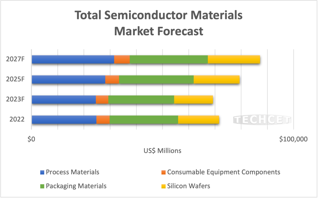 電子材料咨詢公司TECHCET最新數據預測,由于半導體行業整體增長放緩以及晶圓廠產能利用率下滑,2023年半導體材料市場出現3.3%的下滑,但整體半導體材料市場將在2024年反彈,增長近7%,達到740億美元。