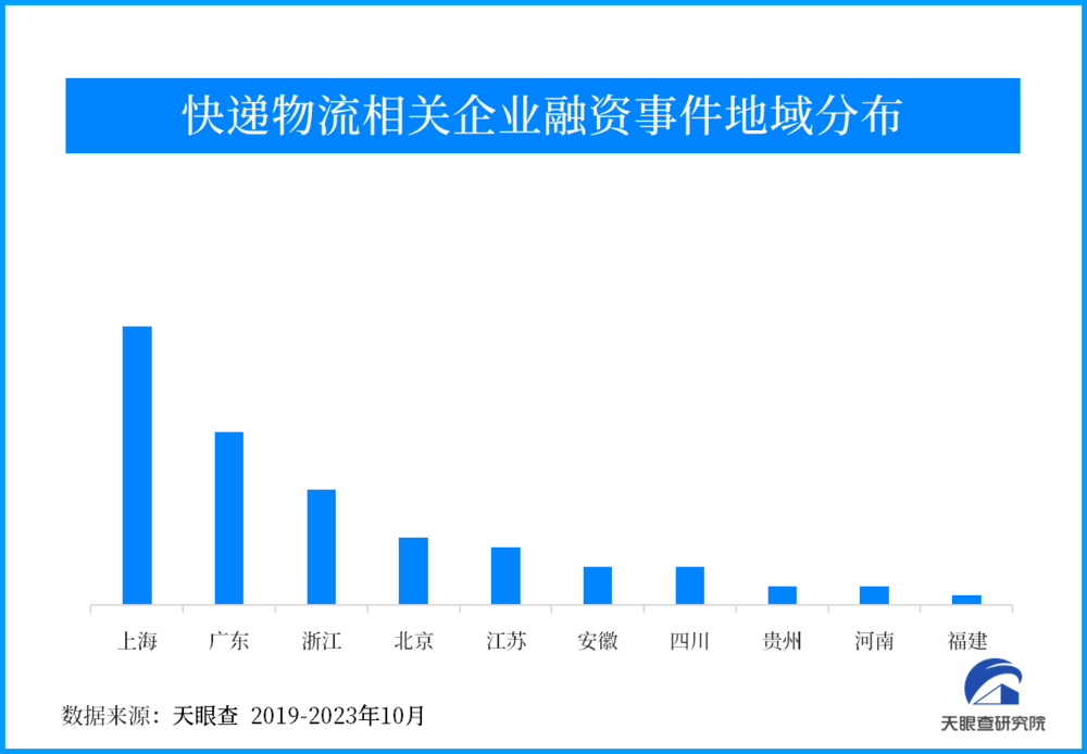從融資事件的地域分布來(lái)看,上海、廣東以及浙江,三地融資事件位居前列,分別擁有29起、18起以及12起。這三個(gè)典型省市有著較多的共同點(diǎn),上海與浙江,尊貴的“包郵區(qū)”,快遞企業(yè)無(wú)法不重視的區(qū)域,另外三省市制造業(yè)、外貿(mào)經(jīng)濟(jì)均較為發(fā)達(dá),尤其是跨境電商,企業(yè)出海的需求加大,快遞物流作為基礎(chǔ)實(shí)施,其作用不言而喻,眾多創(chuàng)業(yè)企業(yè)選擇落戶這三個(gè)地區(qū)就很“正常”了。