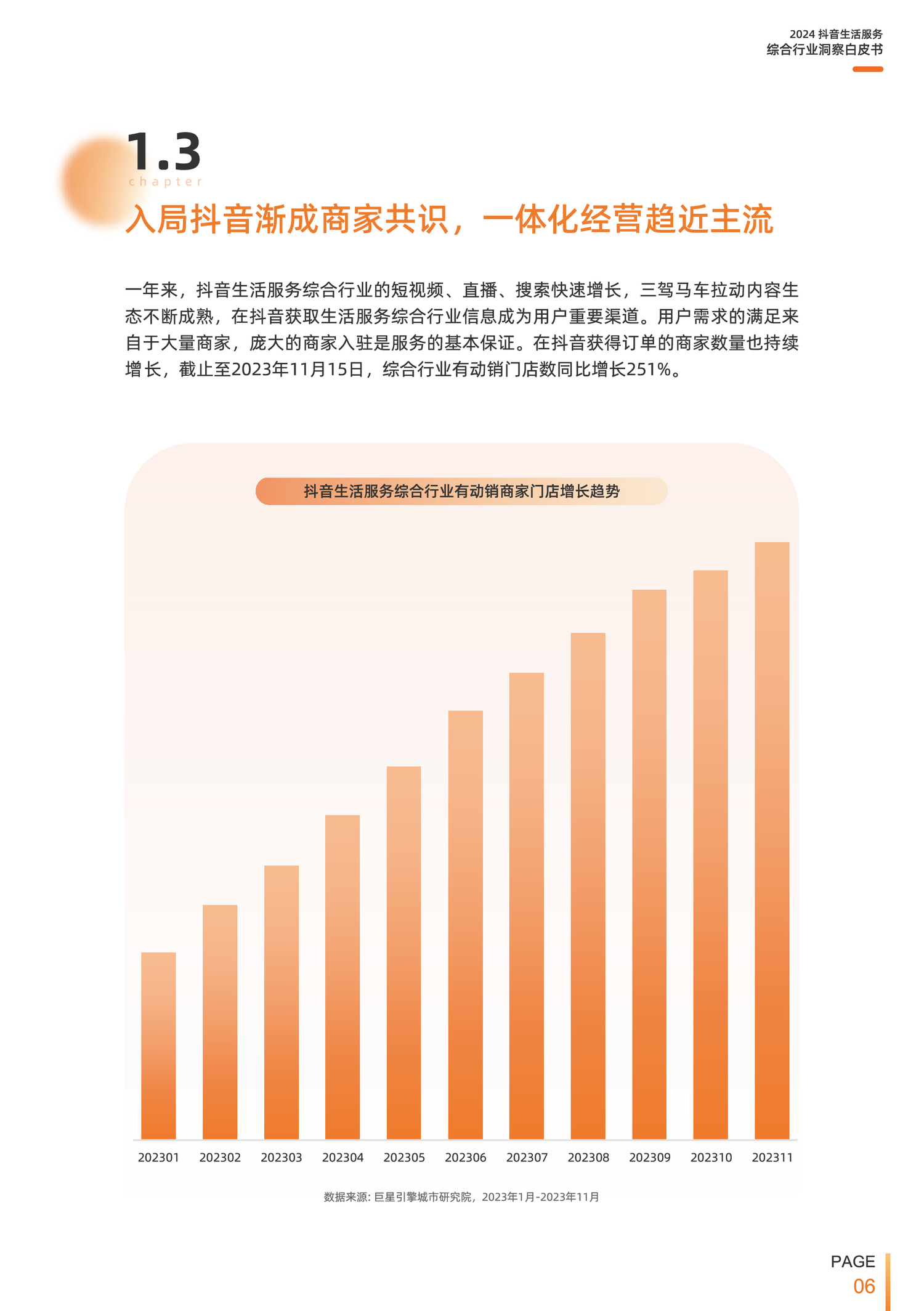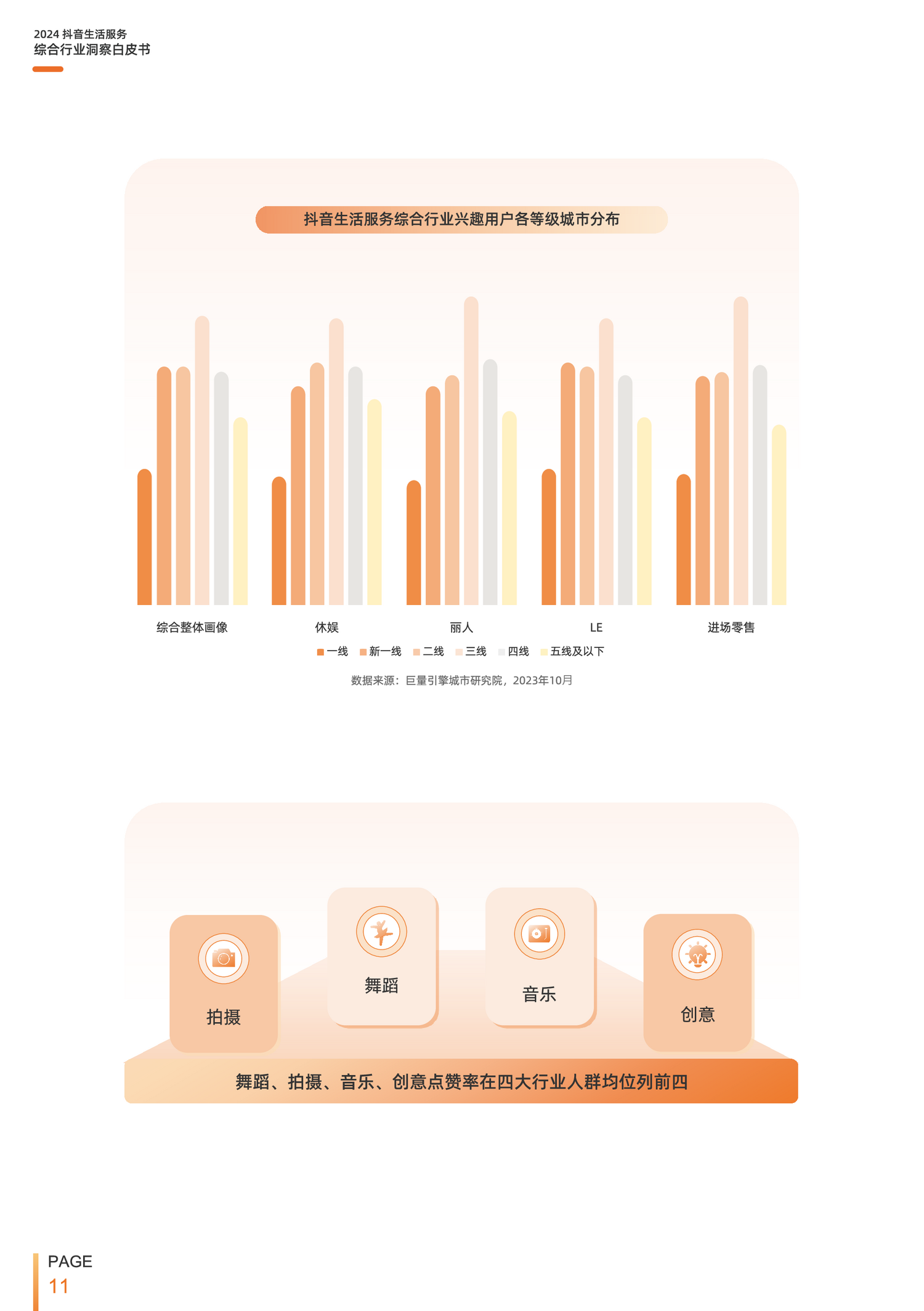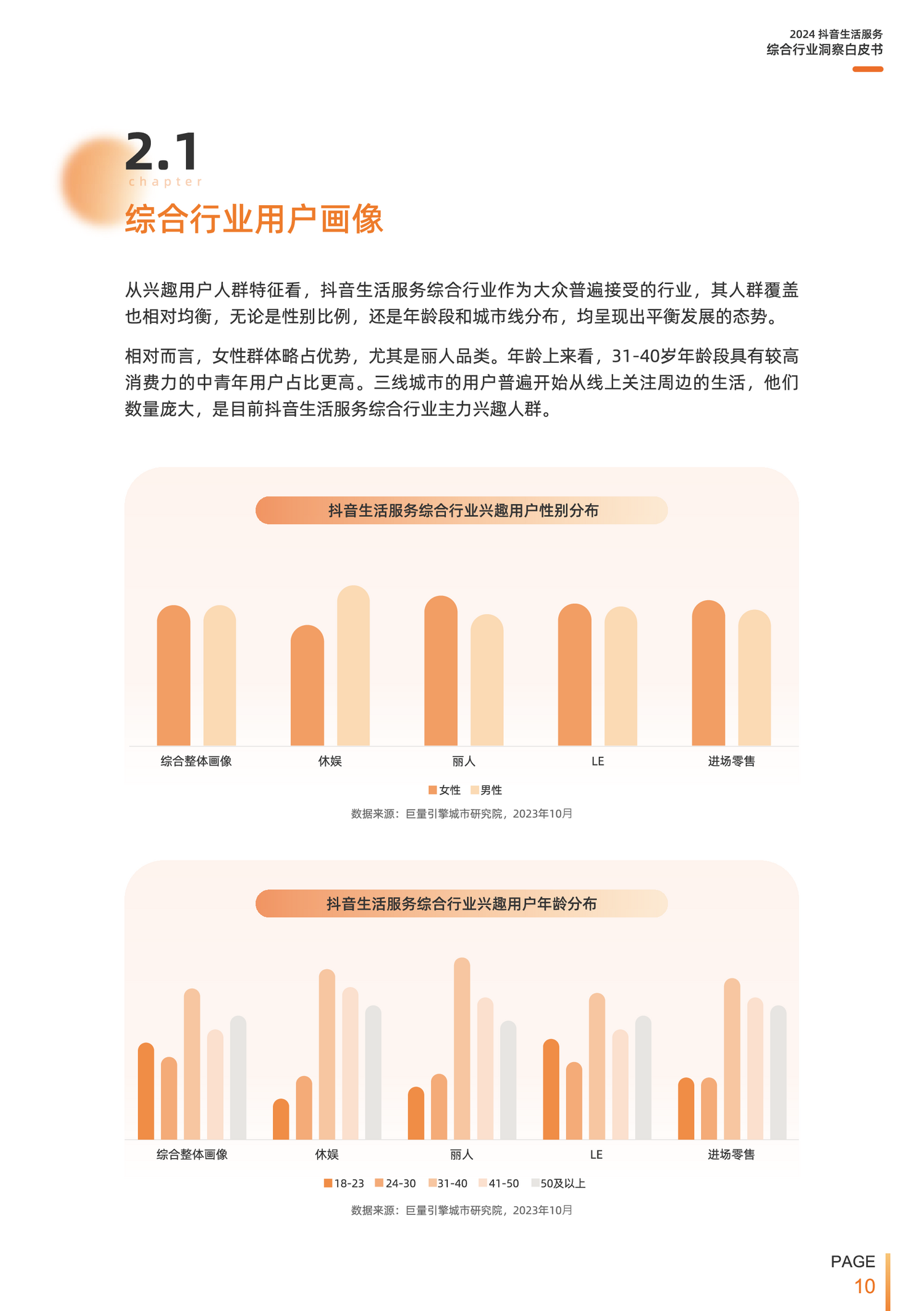巨量引擎城市研究院聯合抖音生活服務發布《2024抖音生活服務綜合行業白皮書》,將從行業、用戶、經營三大視角對抖音生活服務綜合行業進行梳理解讀,通過正當時、新場景、新玩法三大關鍵詞詮釋綜合行業近一年來的發展變化趨勢。