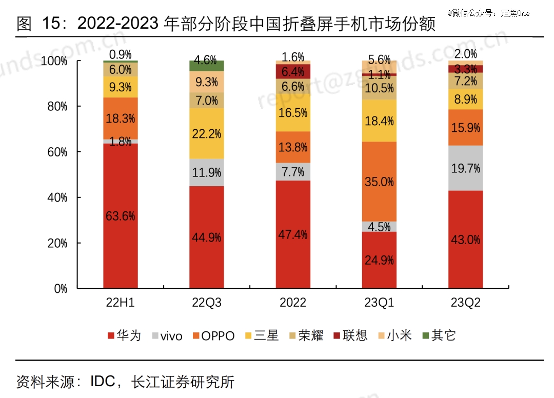 先看折疊屏市場。當(dāng)前的全球格局是,三星*、國內(nèi)廠商快速崛起。當(dāng)然,在折疊屏的主要戰(zhàn)場中國,局面就不同了:目前是華為穩(wěn)居首位,份額在2023年Q2達(dá)到43%;OPPO、vivo在第二梯隊(duì),剩下的榮耀、小米等廠商份額差距不大。