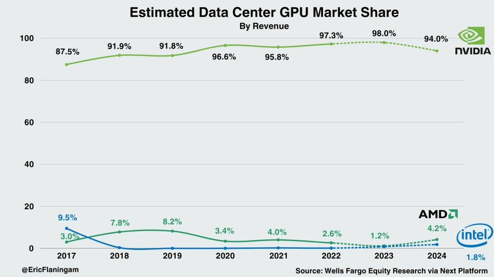 2023 財年,英偉達在該領域的出色財務表現備受矚目。而根據富國銀行股票研究公司的最新估計,2024 年英偉達數據中心業務的收入和市場份額將繼續保持穩定增長。