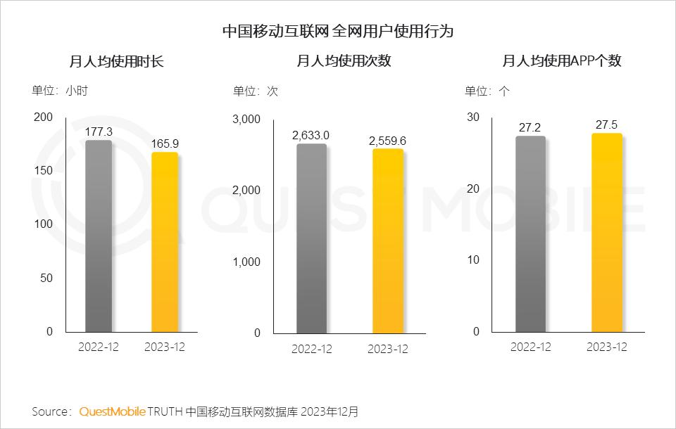 據(jù)QuestMobile近期發(fā)布的《2023中國移動(dòng)互聯(lián)網(wǎng)年度報(bào)告》顯示,移動(dòng)互聯(lián)網(wǎng)流量大盤觸底,用戶網(wǎng)絡(luò)使用粘性較去年同期略有下滑,月人均使用時(shí)長減少11.4小時(shí),折算后人均每天使用時(shí)長5.5小時(shí),幾乎已無提升空間。