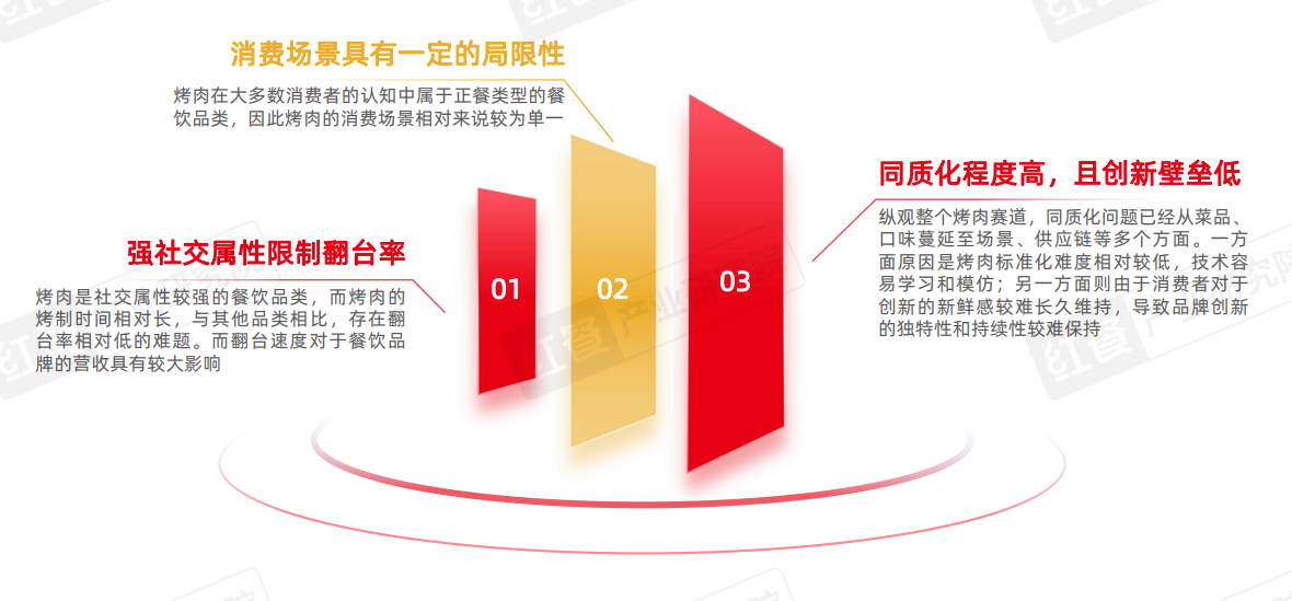 縱觀整個烤肉賽道,其仍有亟待解決的難題。首先是強社交屬性限制了烤肉品牌的翻臺率。其次是烤肉的消費場景具有一定的局限性。除此以外,同質化問題已經從菜品、口味蔓延至場景布置、供應鏈等多個方面。