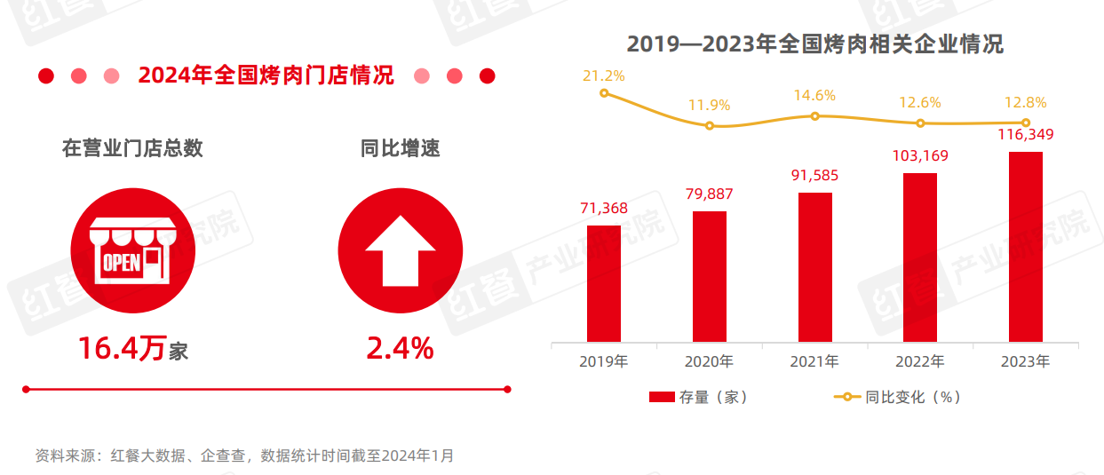 近年,烤肉賽道依舊受餐飲創業者的歡迎,門店數和相關企業存量雙雙增長。具體來看,截至2023年12月,全國烤肉相關企業存量達到11.6萬家,同比增長12.8%。2019—2023年烤肉相關企業存量持續攀升,近年增長速度較2019年略有下降,但整體也保持了10%以上的同比增速。而門店數方面,截至2024年1月,全國烤肉門店數達到16.4萬家,同比增長2.4%。