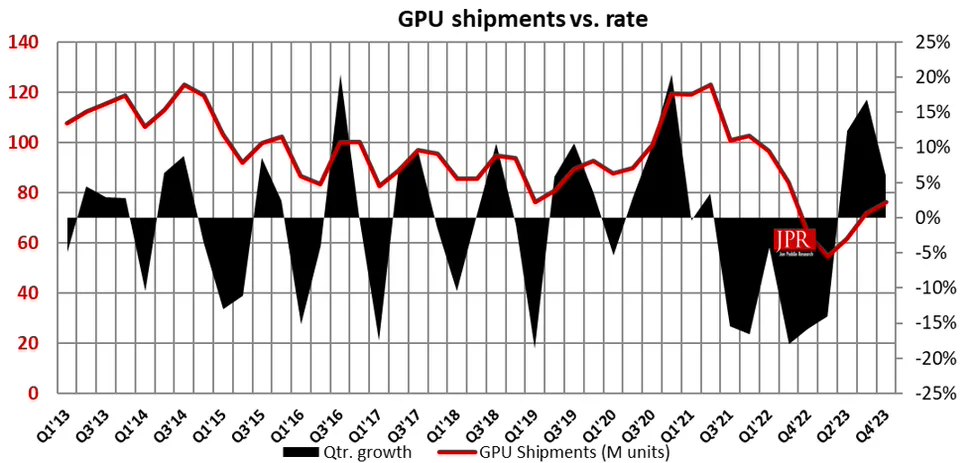 CPU 出貨量復蘇勢頭更加強勁,季度環比增長 9%,同比增長 24%。Jon Peddie Research 沒有提供 AMD 和英特爾 CPU 的具體數據,但 Mercury Research 表示 AMD 在 2023 年表現非常好,盡管其第四季度的表現與第三季度大致持平。